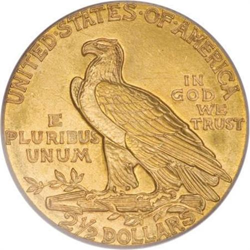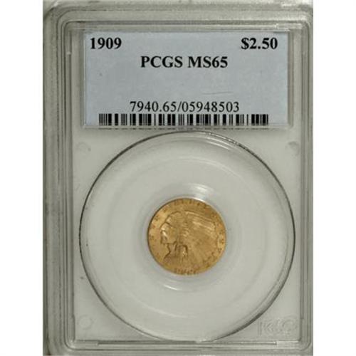 <B>1909 $2 1/2 MS65 PCGS.</B></I> The khaki-gold surfaces have slightly granular luster that resembles the proofs of the year to a certain degree. The numismatist's eye focuses on the boldly impressed devices, where sharp definition is noted on the bonnet feathers and on those of the eagle. A couple of minor luster grazes are present on the reverse.<BR><BR><B>Coin Engraver:</B> Bela Lyon Pratt<BR><BR><b>Shipping:</b> Coins & Currency (<a target="_blank" href="http://www.heritageauctions.com/common/shipping.php">view shipping information</a>\)