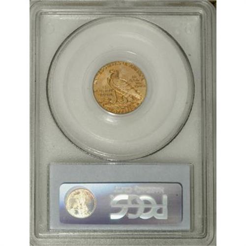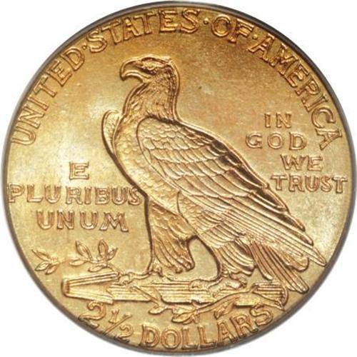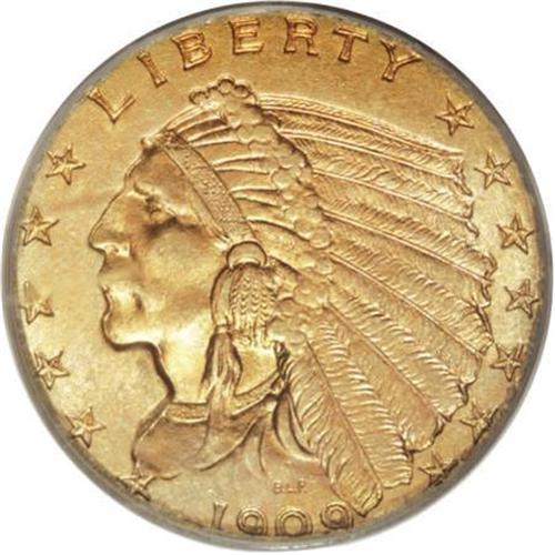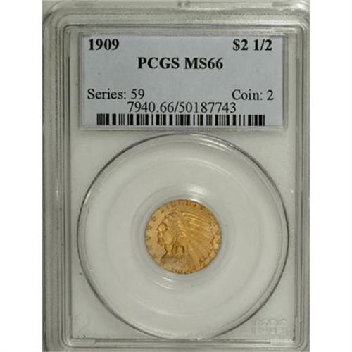 <B>1909 $2 1/2 MS66 PCGS.</B></I> This is an extraordinary example of the design, ranking among the finest pieces of the date that have been certified. An appealing example, this coin has intricate and fully detailed design motifs with outstanding mint frost. Both sides display rich honey-gold luster with hints of lighter gold and subtle blue color. A common issue in all grades through MS65, higher quality pieces are highly illusive and limited to MS66. NGC and PCGS stop at this grade level with none certified at the Superb Gem level. Population: 16 in 66, 0 finer (6/07).<BR><BR><B>Coin Engraver:</B> Bela Lyon Pratt<BR><BR><b>Shipping:</b> Coins & Currency (<a target="_blank" href="http://www.heritageauctions.com/common/shipping.php">view shipping information</a>\)