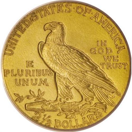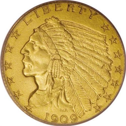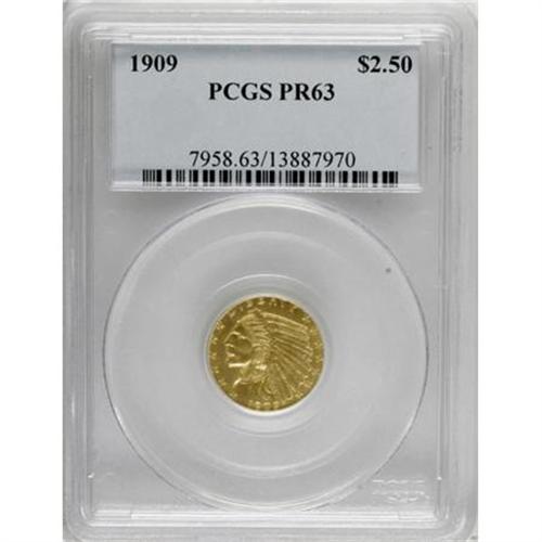 <B>1909 $2 1/2 PR63 PCGS.</B></I> Among proof Indian quarter eagles, the greatest conditional rarity is the 1909. PCGS has certified only a single specimen above PR64, and that piece is graded PR65. The 139-piece mintage of the 1909 is substantially less than adjacent years. The 1908 has a proof production of 236 pieces, while the 1910 has an aberrantly large mintage of 682 proofs. Nonetheless, one suspects that indifferent Mint preparation or handling of the 1909 proofs is the cause of its unusual conditional rarity. The 1909 has a Roman finish slightly brighter than the strictly matte texture 1908. As expected, the strike is precise, but the surfaces are surprisingly smooth, and only intense inspection can locate a few completely trivial hairlines. Population: 18 in 63, 11 finer (6/07).<BR><BR><B>Coin Engraver:</B> Bela Lyon Pratt<BR><BR><b>Shipping:</b> Coins & Currency (<a target="_blank" href="http://www.heritageauctions.com/common/shipping.php">view shipping information</a>\)