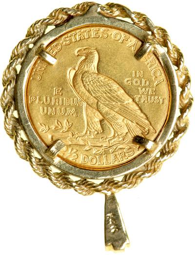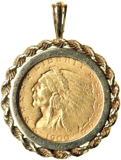 1909 $2½. Cleaned. Housed in a 14kt yellow gold rope bezel. EF 40.