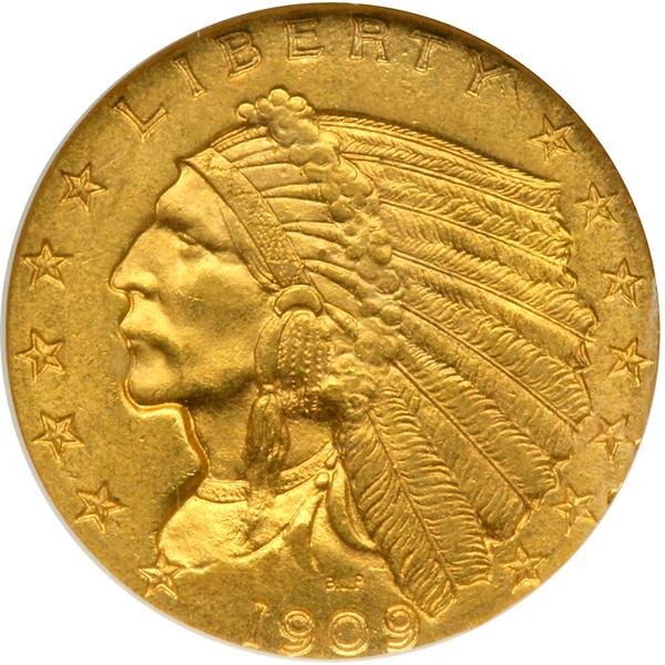 1909 $2.50 Indian. NGC graded MS-63. Well struck with golden toning, this is a pleasant lustrous example struck the second year of issue. The entire Indian $2.50 set consists of 15 coins (PCGS # 7940) .
