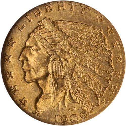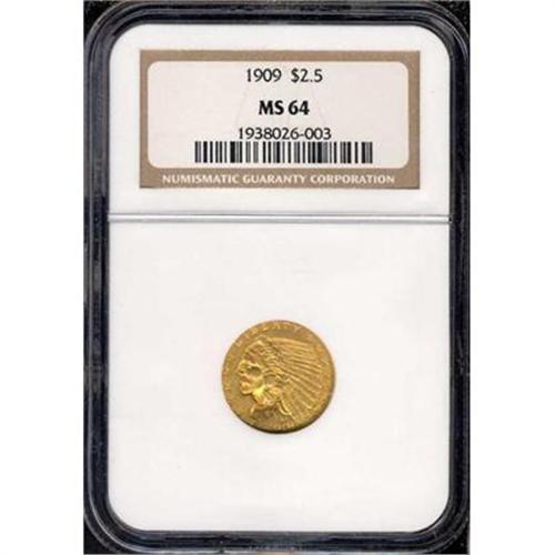 <b>1909 $2.50 Indian. NGC graded MS64.</b> NGC Pop: 485. A blazing golden orange specimen with rich color and bright highlights on the Indian's frosted cheek. Sharp and appealing, and among the most solid MS64 examples of the date certified by the grading service <b>(PCGS # 7940)</b> <i>