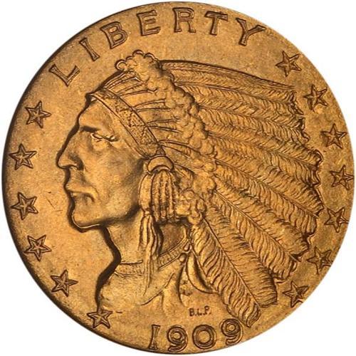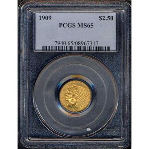 <b>1909 $2.50 Indian. PCGS graded MS65.</b> PCGS Pop: 99. This is a blemish-free case in point of the Gem 1909 Indian two-and-a-half in this grade: sleek gold in color, with mint bloom that grabs hold of the full effect of the careful preservation since it was made <b>(PCGS # 7940)</b> <i>
