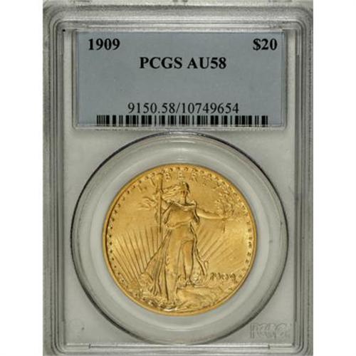 <B>1909 $20 AU58 PCGS.</B></I> PCGS Population (185/1619). NGC Census: (193/902). Mintage: 161,282. Numismedia Wsl. Price for NGC/PCGS coin in AU58: $935. (#9150)<BR><BR><B>Coin Engraver:</B> Augustus Saint-Gaudens<BR><BR><b>Shipping:</b> Coins & Currency (<a target="_blank" href="http://www.heritageauctions.com/common/shipping.php">view shipping information</a>)