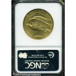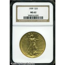 <B>1909 $20 MS62 NGC.</B></I> This is a scarce date with light yellow-gold color and satiny luster. Moderately abraded surfaces. Lot:9486