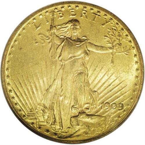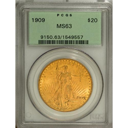 <B>1909 $20 MS63 PCGS.</B></I> 1909 double eagles are scarce in all Mint State grades. This is a pleasing coin for the grade that is sharply defined in all areas. The mint luster is only minimally affected by small abrasions and luster grazes. Housed in an older green-label PCGS holder.<BR><BR><b>Shipping:</b> Coin/Currency (<a target="_blank" href="http://www.heritageauctions.com/common/shipping.php">view shipping information</a>)