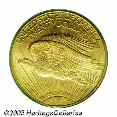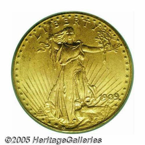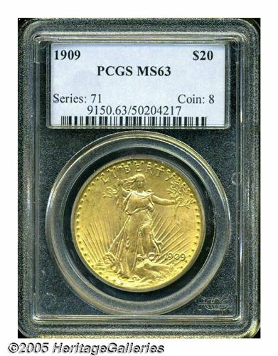 <B>1909<$20> MS63 PCGS.</B></I> A relatively low mintage issue that is further diminished by the unknown production of the 1909/1908 overdate. A satiny deep honey-gold piece with clean fields and a suitable strike. An inconspicuous pinscratch on the eagle's leg does not distract.