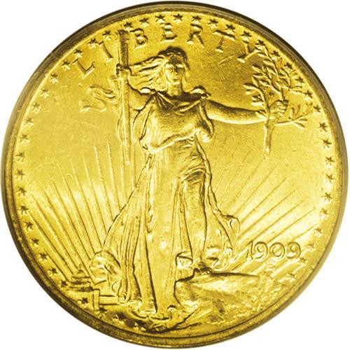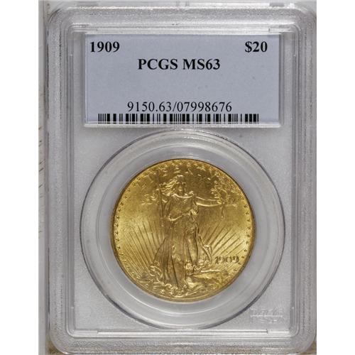 <B>1909<$20> MS63 PCGS.</B></I> This issue is overshadowed by its more illustrious sibling, the 1909/8 overdate, and yet the two issues were produced in about equal numbers. The present example offers rich honey-gold surfaces with beaming luster. A few light ticks are evidence of contact, but they are not overly bothersome or inconsistent with the Select grade. The eye appeal is nonetheless considerable.