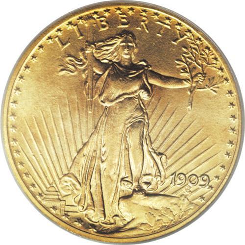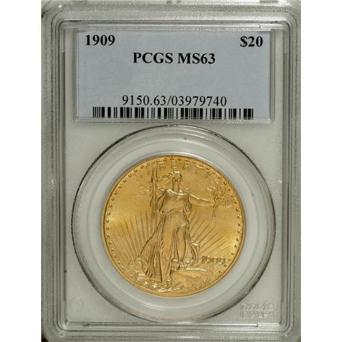 1909 $20 MS63 PCGS. Well struck and lustrous, with bea