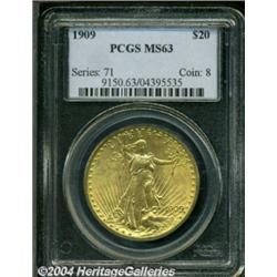 <table><tbody><tr><td><table> <TR><TD width="100%"><TABLE cellSpacing=1 cellPadding=3 width="100%" border=0><TBODY><TR><TD width="100%" bgColor=#79735c><FONT face=arial color=#ffffff size=3><B>Description</B> </FONT></TD></TR><TR><TD width="100%" bgColor=#ffffff><FONT face=arial size=2><B>1909 $20 MS63 PCGS.</B></I> Original, yellow-gold with the usual marks and luster characteristics for a Saint-Gaudens of this grade. 1909 Double Eagles are very scarce in higher Mint State grades. </FONT></TD></TR></TBODY></TABLE></TD></TR></TBODY></TABLE><BR><A name=PricesRealized></A><TABLE cellSpacing=0 cellPadding=0 width="100%" bgColor=#000000 border=0><TBODY><TR><TD width="100%"><TABLE cellSpacing=1 cellPadding=3 width="100%" border=0><TBODY><TR><TD width="100%" bgColor=#79735c><A name=PR><FONT face=arial color=#ffffff size=3><B>Previous Prices from Heritage Auctions</B> </FONT></A></TD></TR><TR><TD bgColor=#f6f6ed><TABLE cellSpacing=0 cellPadding=0 width="100%" border=1><TBODY><TR><TD align=middle width="33%"><B>Date</B></TD><TD align=middle width="33%"><B>Service</B></TD><TD align=middle width="33%"><B>Price</B></TD></TR><TR bgColor=whitesmoke><TD width="33%"><B>12/16/2003</B></TD><TD width="33%">PCGS</TD><TD width="33%">$2,878.45</TD></TR><TR bgColor=whitesmoke><TD width="33%"><B>05/20/2003</B></TD><TD width="33%">NGC</TD><TD width="33%">$2,300.00</TD></TR><TR bgColor=whitesmoke><TD width="33%"><B>10/15/2002</B></TD><TD width="33%">NGC</TD><TD width="33%">$2,185.00</TD></TR><TR bgColor=whitesmoke><TD width="33%"><B>07/02/2002</B></TD><TD width="33%">PCGS</TD><TD width="33%">$2,127.50</TD></TR><TR bgColor=whitesmoke><TD width="33%"><B>01/29/2002</B></TD><TD width="33%">PCGS</TD><TD width="33%">$1,840.00</TD></TR><TR bgColor=whitesmoke><TD width="33%"><B>04/03/2001</B></TD><TD width="33%">PCGS</TD><TD width="33%">$1,900.00</TD></TR><TR bgColor=whitesmoke><TD width="33%"><B>01/23/2001</B></TD><TD width="33%">PCGS</TD><TD width="33%">$1,950.00</TD></TR><TR bgColor=whitesmoke><TD width="33%"><B>05/30/2000</B></TD><TD width="33%">NGC</TD><TD width="33%">$2,200.00</TD></TR><TR bgColor=whitesmoke><TD width="33%"><B>01/07/2004</B></TD><TD width="33%">PCGS</TD><TD width="33%">$2,875.00</TD></TR><TR bgColor=whitesmoke><TD width="33%"><B>09/20/2003</B></TD><TD width="33%">PCGS</TD><TD width="33%">$2,875.00</TD></TR><TR bgColor=whitesmoke><TD width="33%"><B>01/11/2003</B></TD><TD width="33%">NGC</TD><TD width="33%">$1,955.00</TD></TR><TR bgColor=whitesmoke><TD width="33%"><B>09/28/2002</B></TD><TD width="33%">PCGS</TD><TD width="33%">$2,070.00</TD></TR><TR bgColor=whitesmoke><TD width="33%"><B>02/24/2002</B></TD><TD width="33%">NGC</TD><TD width="33%">$1,552.50</TD></TR><TR bgColor=whitesmoke><TD width="33%"><B>10/06/2000</B></TD><TD width="33%">PCGS</TD><TD width="33%">$2,070.00</TD></TR><TR bgColor=whitesmoke><TD width="33%"><B>06/10/2000</B></TD><TD width="33%">PCGS</TD><TD width="33%">$1,840.00</TD></TR><TR bgColor=whitesmoke><TD width="33%"><B>04/23/1999</B></TD><TD width="33%">PCGS</TD><TD width="33%">$3,220.00</TD></TR><TR bgColor=whitesmoke><TD width="33%"><B>01/11/1997</B></TD><TD width="33%">PCGS</TD><TD width="33%">$2,357.50</TD></TR><TR bgColor=whitesmoke><TD width="33%"><B>01/06/1996</B></TD><TD width="33%">PCGS</TD><TD width="33%">$2,200.00</TD></TR><TR bgColor=whitesmoke><TD width="33%"><B>09/10/1993</B></TD><TD width="33%">NGC</TD><TD width="33%">$5,390.00</TD></TR><TR bgColor=whitesmoke><TD width="33%"><B>11/01/2001</B></TD><TD width="33%">NGC</TD><TD width="33%">$1,725.00</TD></TR><TR bgColor=whitesmoke><TD width="33%"><B>01/01/1996</B></TD><TD width="33%">PCGS</TD><TD width="33%">$2,530.00</TD></TR></TBODY></TABLE></TD></TR><TR><TD bgColor=#ffffff><FONT face=arial size=1 ?>PLEASE NOTE: All prices realized reflect the final hammer price PLUS the buyer's premium in auctions that charge a buyer's premium. Each item has a notation at the top of the listing indicating whether that lot included a buyer's premium. Example: A item that sells with a final hammer price of $100 and a 20% buyer's premium will display with a price realized of $120. All information listed is intended to be as accurate as possible, but errors are possible. Please use this guide carefully and inform us of any inaccuracies. </FONT></TD></TR></TBODY></TABLE></TD></TR></TBODY></TABLE><BR><TABLE cellSpacing=0 cellPadding=0 width="100%" bgColor=#000000 border=0><TBODY><TR><TD width="100%"><TABLE cellSpacing=1 cellPadding=3 width="100%" border=0><TBODY><TR><TD width="100%" bgColor=#79735c colSpan=6><FONT face=arial color=#ffffff size=3><B>Price Guide*</B> </FONT></TD></TR><TR bgColor=#f6f6ed><TD align=middle><B>Grade</B> </TD><TD align=middle><B>Coin World<BR>(Trends)</B> </TD><TD align=middle><B>Numismedia<BR>Retail</B> </TD><TD align=middle><B>Numismedia<BR>Wholesale</B> </TD><TD align=middle><B>Coin<BR>Universe</B> </TD><TD align=middle><B>Heritage<BR>Value Index</B> </TD></TR><TR bgColor=#ffffff><TD align=middle>62</TD><TD align=right>$1,500.00</TD><TD align=right>$970.00</TD><TD align=right>$775.00</TD><TD align=right>$1,025.00</TD><TD align=right>$1,161.19</TD></TR><TR style="FONT-WEIGHT: bold" bgColor=#cccfdd><TD align=middle>63</TD><TD align=right>$4,000.00</TD><TD align=right>---</TD><TD align=right>$2,150.00</TD><TD align=right>$3,300.00</TD><TD align=right>$2,524.25</TD></TR><TR bgColor=#ffffff><TD align=middle>64</TD><TD align=right>$10,000.00</TD><TD align=right>---</TD><TD align=right>$5,200.00</TD><TD align=right>$6,850.00</TD><TD align=right>$6,980.00</TD></TR><TR bgColor=#ffffff><TD colSpan=6><FONT size=1>*All information listed is intended to be as accurate as possible, but errors are possible. No item may be returned or refused based on this information which is provided as a service to our customers. You should contact each pricing source directly to determine the accuracy of this information. </FONT></TD></TR></TBODY></TABLE></TD></TR></TBODY></TABLE><BR><TABLE cellSpacing=0 cellPadding=0 width="100%" bgCo