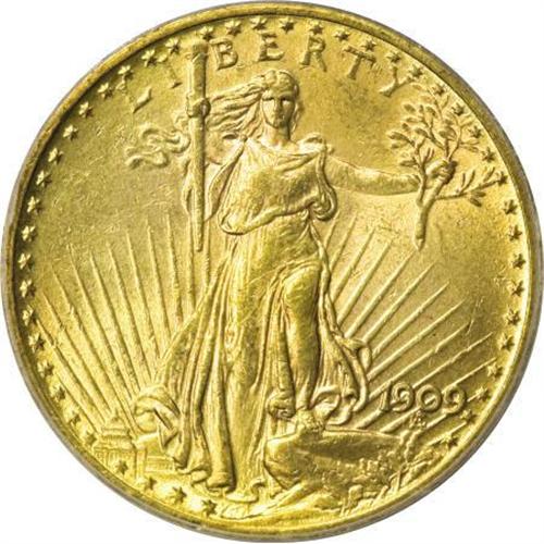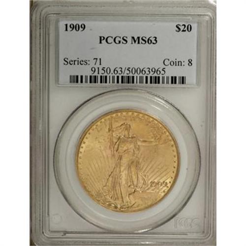 <B>1909 $20 MS63 PCGS.</B></I> The 1909 and 1909/8 double eagles show virtually identical certified populations, presumably reflecting a 50:50 split between the overdate and nonoverdate varieties. This regular-date piece shows tinges of orange and green over lustrous, frosty, and lightly abraded surfaces.<BR><BR><B>Coin Engraver:</B> Augustus Saint-Gaudens<BR><BR><b>Shipping:</b> Coins & Currency (<a target="_blank" href="http://www.heritageauctions.com/common/shipping.php">view shipping information</a>)