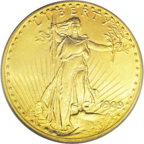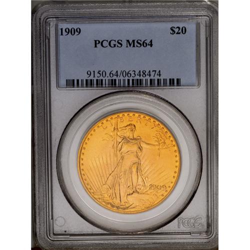 <B>1909<$20> MS64 PCGS.</B></I> An exceedingly difficult condition scarcity. This is a very strong, borderline Gem whose reverse is slightly finer than the obverse. Boldly struck and remarkably clean overall with deep, attractive, tangerine-gold color. It is difficult to find a higher-graded example of the 1909 double eagle.<BR><I>From The Jackson Hole Collection.</B></I>