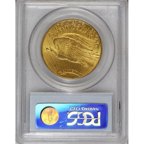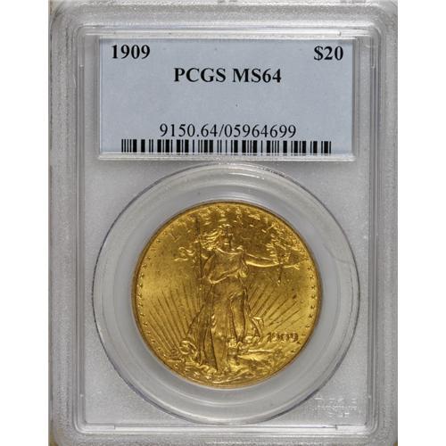 <B>1909 $20 MS64 PCGS.</B></I> If current numismatic estimates are correct, then approximately 80,000 examples of the 1909 non-overdate double eagle were produced. This statement assumes that around half of the total mintage consisted of 1909/8 overdate coins. If these assumptions are true, then it is not surprising that the 1909 has remained a conditionally scarce issue, as befits its presumed status as a low mintage issue in the Saint-Gaudens series. This near-Gem example is well struck and lustrous, with a bright, satiny appearance and attractive green-gold toning. Scattered small surface marks are appropriate for the grade.<BR><BR><b>Shipping:</b> Coins & Currency (<a target="_blank" href="http://www.heritageauctions.com/common/shipping.php">view shipping information</a>)