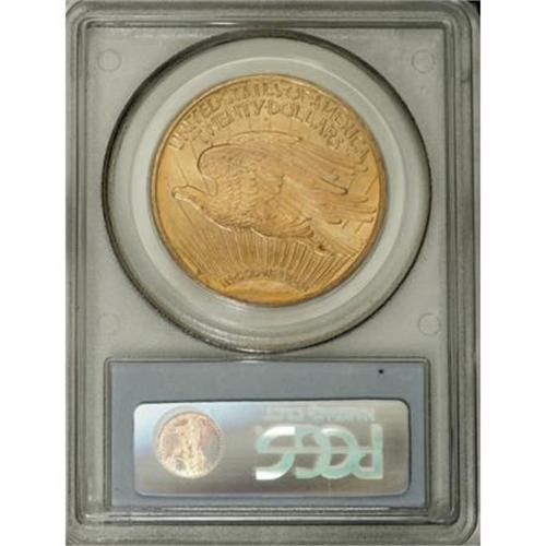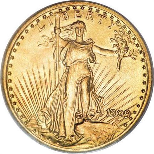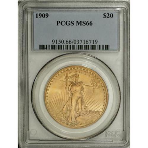 <B>1909 $20 MS66 PCGS.</B></I> The 1909 Saint-Gaudens double eagle is a conditionally scarce issue that was not fully recognized as such for many years. This scarcity was modified somewhat by the discovery of a hoard of several hundred pieces in the early 1980s. That hoard made lower grade Uncirculated coins available, but Choice Uncirculated and finer examples remain elusive. The total mintage of the 1909 was a mere 161,282 pieces. This mintage figure was apparently almost equally divided between examples of the 1909/8 overdate variety and coins struck from "perfect" dies, like the currently offered Premium Gem. Thus, the mintage of the 1909 non-overdate issue should perhaps be reported as (approximately) 80,000 coins.<BR> The devices are sharply struck throughout, and the variegated peach and orange-gold coloration is also imbued with tinges of pale green. Each side is awash in softly frosted luster. Rarely are these large gold coins found with such minimally marked surfaces. This specimen is individually identifiable by three minuscule abrasions in the right obverse field, below Liberty's arm. Other than a nick in the lower left obverse field, and slight stacking friction on the upper half of the sun, no other potential pedigree markers are observed on either side. The combined NGC and PCGS population figures show a total of 10 pieces graded at MS66 (some of these are likely resubmissions), and, significantly, none are certified any finer at either service (11/07). <BR><I>From The Jacob Collection of Saint-Gaudens Double Eagles.</B></I><BR><BR><B>Coin Engraver:</B> Augustus Saint-Gaudens<BR><BR><b>Shipping:</b> Coins & Currency (<a target="_blank" href="http://www.heritageauctions.com/common/shipping.php">view shipping information</a>)