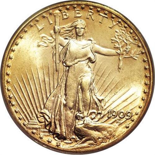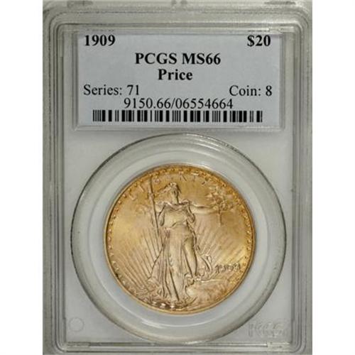 <B>1909 $20 MS66 PCGS.</B></I> Ex: Price. Writing in the catalog of the Dr. Thaine B. Price Collection, David Akers said of this marvelous piece, now certified MS66 by PCGS but at the time unencapsulated or "raw":<BR><B><BR>"1909, Gem Uncirculated. </B></I>Very sharply struck with the broad border that is seen on most early With Motto Saint-Gaudens Double Eagles. (It is not quite as broad and uniform as on the 1908 With Motto, however). This piece is very lustrous with superb medium orange gold color as well as a few attractive and distinctive copper spots plus one small dark stain (not carbon) on the obverse near the rim at K-8. There are a few light bagmarks in the fields, but the figure of Liberty and the eagle are very clean. This is an absolutely outstanding 1909 Double Eagle, one of the finest to appear at auction in a number of years. It is also substantially finer than any of the specimens from the hoard of 1909 Double Eagles that have come onto the market in recent years. <BR><BR>Akers' catalog description continues by discussing the relative rarity of the 1909 and 1909/8 issues in relation to a recently released hoard of 1909s into the marketplace: <BR><BR>"Prior to the appearance on the market recently of a substantial number of mint state specimens, the 1909 Saint-Gaudens Double Eagle was generally considered to be much more scarce than it is now known to be. Hundreds of specimens have come onto the market over the past few years from one large hoard, and many of these specimens are attractive and fairly high quality, although most of them grade Choice Uncirculated or lower. A moderate number, however, are Very Choice Uncirculated, but I am not aware of any that have graded Gem. As a result, although the 1909 is now readily available in Choice Uncirculated, and only moderately rare in Very Choice Uncirculated, Gems like this one are still at the highest rarity level and among the most difficult to obtain in the series. For some reason, the 1909 has always been overshadowed by the 1909/8, probably just due to the latter's popularity as an overdate. However, it has been my experience that Gems of the 1909 issue are definitely more difficult to locate than Gems of the 1909/8, although both issues can legitimately be considered very rare in Gem Uncirculated condition."<B> </B></I><BR><BR>Any such hoards of 1909 double eagles have by now been well-absorbed into the marketplace, and today the certified populations of the overdate and nonoverdate are just about equal. But as Akers intimated, the 1909 double eagle is now coming to the forefront as a major rarity in MS64 or finer, and in MS66, this specimen is among the handful of finest known for the issue, one of six so certified at PCGS, with none finer (3/08). We must also add that what Akers called "copper spots" we would classify merely as deep, attractive amber-gold toning near the rims--although the small dark stain at 8 o'clock provides positive confirmation that this is in fact the same coin, as does plate-matching. <BR><I>Ex: Dr. Thaine B. Price Collection (David Akers Numismatics, 5/1998), lot 80, which realized $35,750.</B></I><BR><BR><B>Coin Engraver:</B> Augustus Saint-Gaudens<BR><BR><b>Shipping:</b> Coins & Currency (<a target="_blank" href="http://www.heritageauctions.com/common/shipping.php">view shipping information</a>)