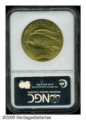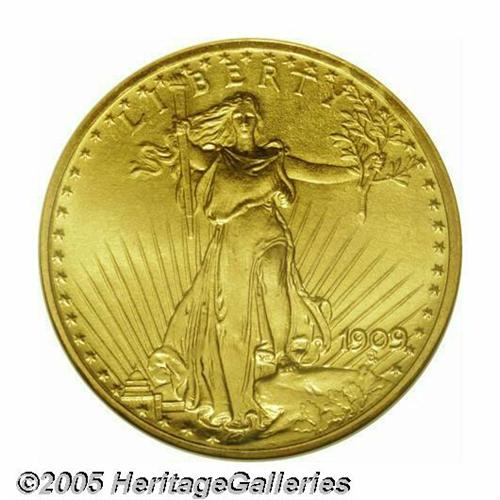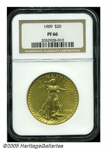<B>1909<$20> PR66 NGC.</B></I> There were 67 proof double eagles officially struck in 1909. An interesting numismatic sidenote is mentioned in Akers' (1981) book on this series, and we quote in part: "In my 443 catalogue survey, the 1909 appeared more often in proof than any other Saint-Gaudens double eagle. I have no explanation for this since it has been my experience that the 1909 is one of the rarest proofs of this type. It is more rare than most of the Liberty Head proofs after 1895. It is my opinion that no more than 20-25 proofs of this date still exist." It would seem that 28 appearances of proofs in his survey was only a statistical aberration, and we would agree that 1909 proof twenties are indeed much rarer than indicated by the number recorded in his survey. We tend to believe, however, that the number of survivors is somewhat higher than stated by Akers and would estimate that somewhere between 25 and 35 proofs may still exist. <BR> All proof twenties struck this year were of the Roman Gold variant of the matte proofing process. As such, the coin has an exceptionally bright, sparkling appearance for a matte proof. The surfaces have a pleasing rich yellow-gold color. Population: 8 in 66, 2 finer (5/05).