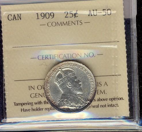 1909 25¢ ICCS AU50. Bright example with light rim tone.