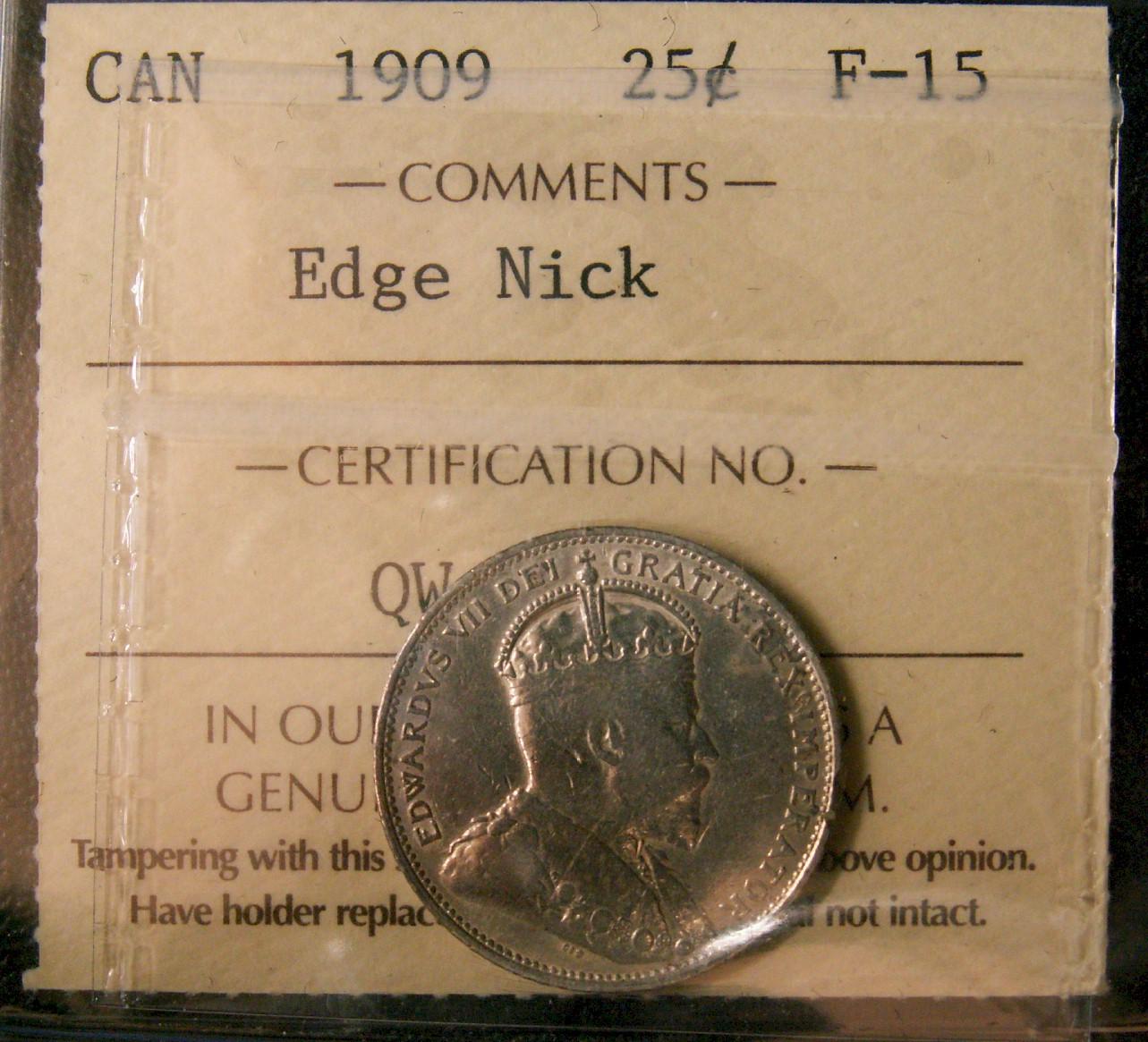 1909 25¢ ICCS F15. A nice example with light rim nick.