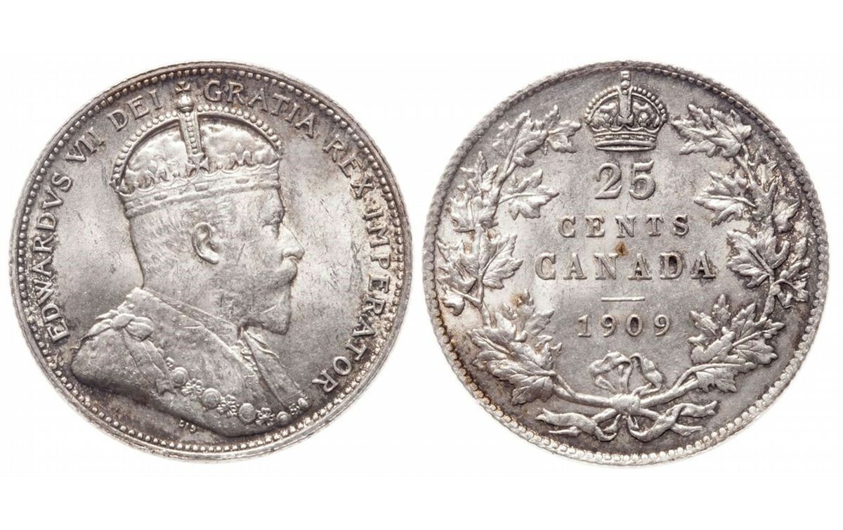 1909 25¢ ICCS MS64. Attractive strong lustre. Scarce date in mintstate condition.