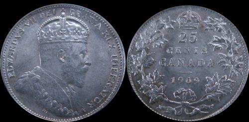 1909 25¢ ICCS MS64PQ+ Brilliant with light golden tone over full lustre. A very nice and scarce Edward VII example. Looks better than the grade assigned.