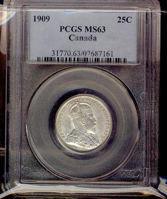 1909 25¢ PCGS MS-63 Brilliant with lots of luster. Excellent strike with clean fields.