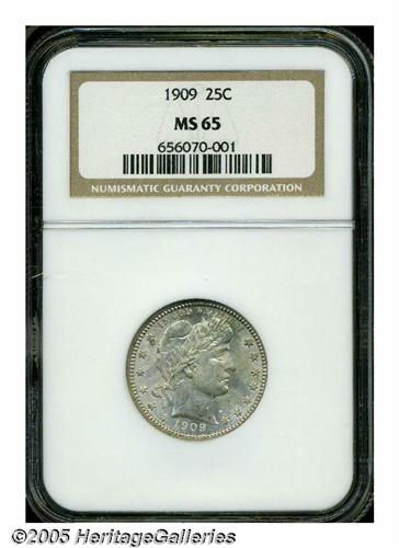<B>1909<25C> MS65 NGC.</B></I> Lustrous surfaces display rose, ice-blue, and olive-green patina on the obverse, and deeper reddish-gold and lavender color on the obverse. The design features are sharply struck, and there are seemingly no significant marks.
