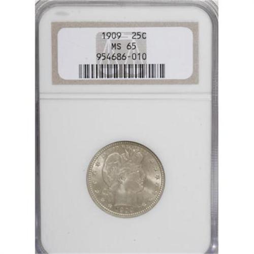 <B>1909 25C MS65 NGC.</B></I> A light coating of argent patina is seen over each side. Well struck, the reverse field imparts a partial prooflike appearance. Census: 32 in 65, 15 finer (1/08).<BR><I>From The Southwest Collection.</B></I><BR><BR><B>Coin Engraver:</B> Charles E. Barber<BR><BR><b>Shipping:</b> Coins & Currency (<a target="_blank" href="http://www.heritageauctions.com/common/shipping.php">view shipping information</a>)