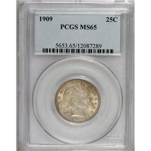 <B>1909 25C MS65 PCGS.</B></I> Well struck and highly lustrous, with immaculately preserved surfaces. Light speckled patina near the peripheries increases the eye appeal of the piece. An alluring and conditionally scarce Gem. Population: 54 in 65, 18 finer (8/07). <BR><BR><B>Coin Engraver:</B> Charles E. Barber<BR><BR><b>Shipping:</b> Coins & Currency (<a target="_blank" href="http://www.heritageauctions.com/common/shipping.php">view shipping information</a>)