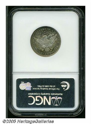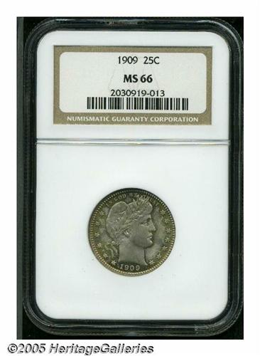 <B>1909<25C> MS66 NGC.</B></I> This attractive Premium Gem is well struck, with lustrous steel-gray surfaces and rich original lime-green and russet toning clinging to the outer devices. Well preserved, the coin shows just a couple of minor hits in the right obverse field. Population: 15 in 66, 2 finer (6/05).