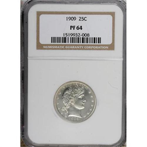 <B>1909 25C PR64 NGC.</B></I> NGC Census: (55/105). PCGS Population (51/68). Mintage: 650. Numismedia Wsl. Price for NGC/PCGS coin in PR64: $800. (#5695)<BR><BR><B>Coin Engraver:</B> Charles E. Barber<BR><BR><b>Shipping:</b> Coins & Currency (<a target="_blank" href="http://www.heritageauctions.com/common/shipping.php">view shipping information</a>\)
