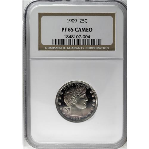 <B>1909<25C> PR65 Cameo NGC.</B></I> Fully struck with frosted devices and lovely cameo contrast which is more noteworthy on the obverse. The fields betray deep charcoal-violet coloration which is partially interrupted by a dappled pattern of milky green-gray color on the reverse. Beautifully preserved on both sides.