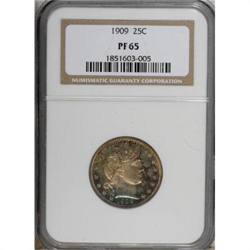 <B>1909 25C PR65 NGC.</B></I> The 1909 proof quarter comes with a mintage of 650 pieces. The Gem specimen in this lot displays splotches of cobalt-blue, golden-brown, and lavender toning, and exquisitely struck design elements. Both sides are well preserved.<BR><BR><b>Shipping:</b> Coins & Currency (<a target="_blank" href="http://www.heritageauctions.com/common/shipping.php">view shipping information</a>)