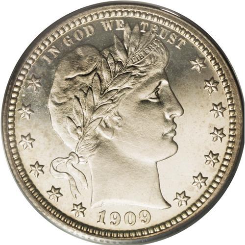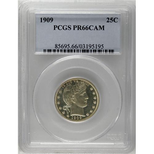 <B>1909<25C> PR66 Cameo PCGS.</B></I> Light, consistent gold toning enriches this unabraded and beautiful high grade proof Barber quarter. The strike is precise on the fletchings and right wing joint, and the eye appeal is substantial. Delicately frosted devices rise above smooth, glass-like fields. Population: 13 in 66 Cameo, 4 finer (6/06).<BR><I>From The Mulholland Collection.</B></I>