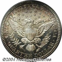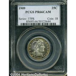 <B>1909<25C> PR66 Cameo PCGS.</B></I> A glittering specimen of exceptional quality, being toned in golden-orange and violet hues that lighten to near-brilliance in the centers. The design elements are exquisitely struck. Only 650 proofs were struck, only a small minority of which qualify for high quality Cameo status. Population: 6 in 66, 3 finer (3/04). <BR><BR><B>Important notice:</B> Heritage usually auctions material at the rate of 200-250 lots per hour. On some occasions eBay Live bid software or the Internet may not be able to keep up with the pace of the auction. We recommend placing a realistic absentee bid now as insurance to avoid disappointment. Occasionally the auctioneer may eliminate or reject an eBay Live bid, and the auctioneer may also reopen a lot after the close of the eBay live bidding (usually because we missed an audience bid), and may reject your bid even if it shows you as the winning bidder. By bidding via eBay Live, you agree that Heritage may award the lot to another bidder at its sole discretion under the circumstances described above or any other reasonable circumstances. Since eBay bids are not shown to us until we open the lot on the floor, we treat those bids just like floor bids. In most cases the floor responds before the eBay bid is presented to us, due to Internet lag time, so for consistency we have made it a policy that floor bids are always considered first over tie eBay live bids. Also please note that all Heritage lots purchased through eBay Live carry a 20% Buyer's Premium. Please make sure you read the Terms and Conditions before you bid. </span></font></tr></table></td></tr></table>