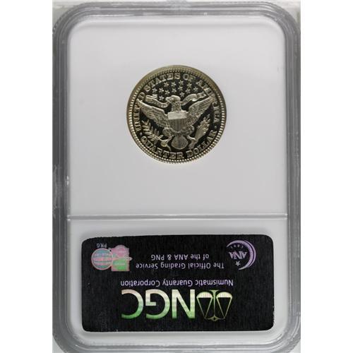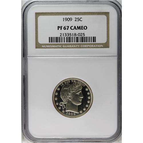 <B>1909<25C> PR67 Cameo NGC.</B></I> Frosty devices contrast with dark, smooth, glassy fields. This well struck Superb Gem is close to brilliant, although absolute accuracy compels us to note that traces of steel-blue make infrequent appearances along the reverse periphery. A mere 650 proofs were struck. Census: 7 in 67 Cameo, 1 finer (6/06).<BR><I>From The Mulholland Collection.</B></I>
