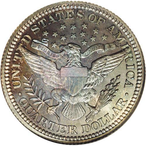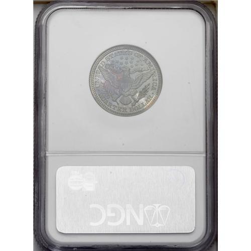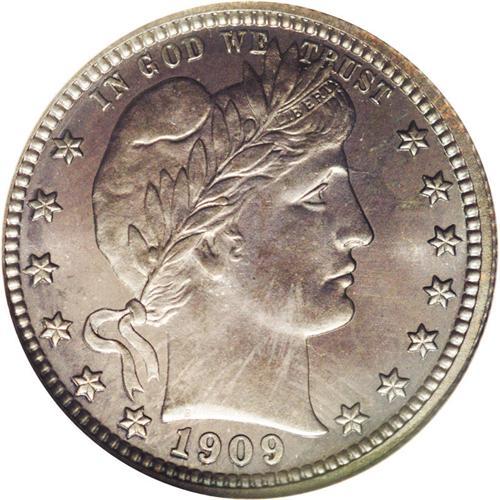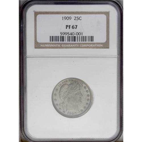 <B>1909<25C> PR67 NGC.</B></I> This is a deeply toned Superb Gem example with sharp design features. The devices are frosty and surrounded by deeply mirrored fields, although the toning masks both features to a certain degree. Dark gray, steel, and blue with a splash of fuchsia iridescence particularly at the center of the reverse. Outstanding quality for this date and worthy of any collection. Census: 24 in 67, 9 finer (4/06).
