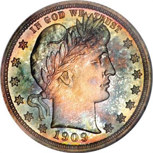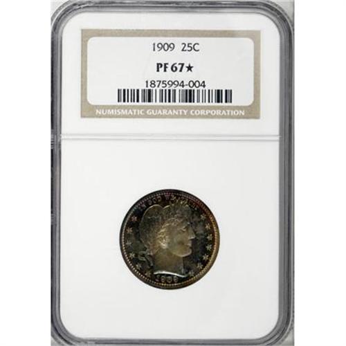 <B>1909 25C PR67 <img src="/images/star.gif" width="10" height="10" alt="" border="0"> NGC.</B></I> A mélange of olive-green, ocean-blue, lavender, and gold patination bathes both faces of this Superb Gem quarter that has been assigned the coveted Star designation. Impeccably preserved surfaces reveal no reportable marks, and all of the design features are well brought up. Census: 1 in 67 <B><img src="/images/star.gif" width="10" height="10" alt="" border="0"></B></I>, 0 finer (11/07).<BR><BR><B>Coin Engraver:</B> Charles E. Barber<BR><BR><b>Shipping:</b> Coins & Currency (<a target="_blank" href="http://www.heritageauctions.com/common/shipping.php">view shipping information</a>)