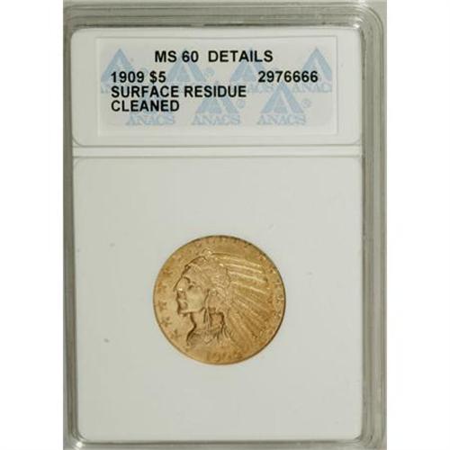 <B>1909 $5 --Cleaned, Surface Residue--ANACS. MS60 Details.</B></I> NGC Census: (115/2593). PCGS Population (88/1964). Mintage: 627,138. Numismedia Wsl. Price for NGC/PCGS coin in MS60: $360. (#8513)<BR><BR><b>Shipping:</b> Coins & Currency (<a target="_blank" href="http://www.heritageauctions.com/common/shipping.php">view shipping information</a>)