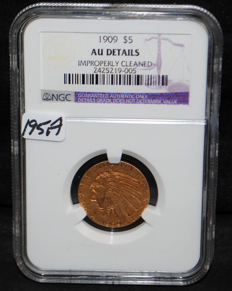 1909 $5 INDIAN GOLD COIN - NGC AU DETAILS (IMPROPERLY CLEANED) - THE CURRENT COIN WORLD TRENDS LISTS AN AU50 @ $500.00 AND AN AU58 @ $575.00