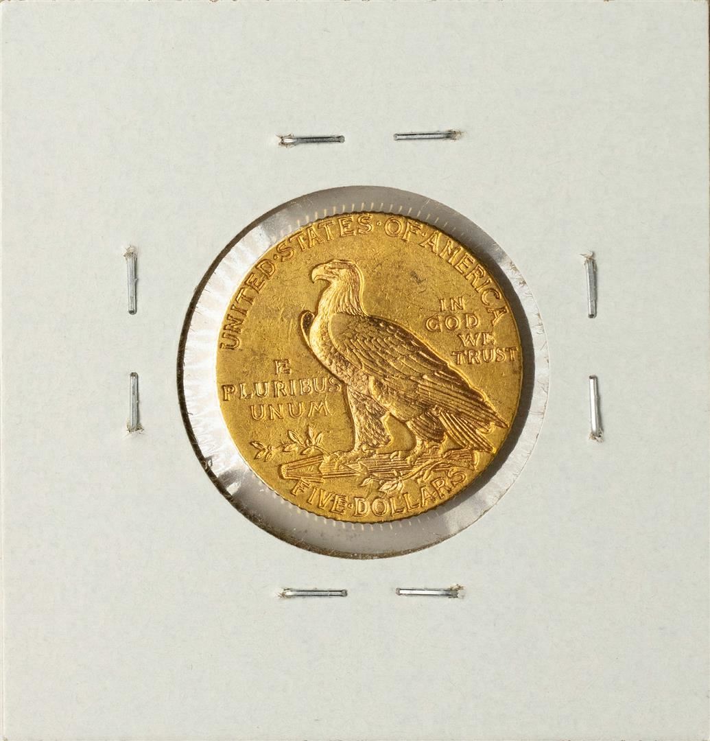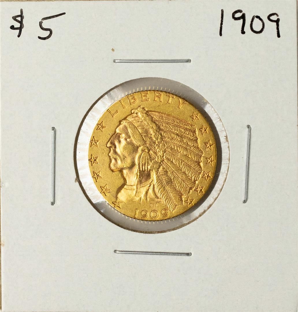 One 1909 $5 Indian Head Half Eagle Gold Coin.
