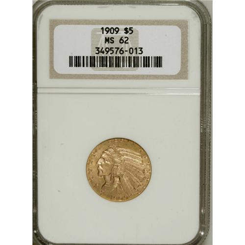 <B>1909 $5 MS62 NGC.</B></I> NGC Census: (1090/665). PCGS Population (805/860). Mintage: 627,138. Numismedia Wsl. Price for NGC/PCGS coin in MS62: $1,175. (#8513)<BR><BR><b>Shipping:</b> Coins & Currency (<a target="_blank" href="http://www.heritageauctions.com/common/shipping.php">view shipping information</a>)