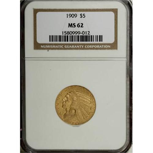 <B>1909 $5 MS62 NGC.</B></I> NGC Census: (1132/693). PCGS Population (831/894). Mintage: 627,138. Numismedia Wsl. Price for NGC/PCGS coin in MS62: $1,100. (#8513)<BR><BR><B>Coin Engraver:</B> Bela Lyon Pratt<BR><BR><b>Shipping:</b> Coins & Currency (<a target="_blank" href="http://www.heritageauctions.com/common/shipping.php">view shipping information</a>)