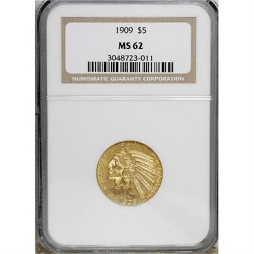 <B>1909 $5 MS62 NGC.</B></I> Sharply detailed with brilliant khaki-gold color. This is a splendid piece for the date specialist or type collector.<BR><BR><B>Coin Engraver:</B> Bela Lyon Pratt<BR><BR><b>Shipping:</b> Coins & Currency (<a target="_blank" href="http://www.heritageauctions.com/common/shipping.php">view shipping information</a>)