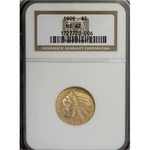 <B>1909 $5 MS62 NGC.</B></I> . NGC Census: (1166/730). PCGS Population (871/956). Mintage: 627,138. Numismedia Wsl. Price for NGC/PCGS coin in MS62: $1,025. (#8513)<BR><BR><B>Coin Engraver:</B> Bela Lyon Pratt<BR><BR><b>Shipping:</b> Coins & Currency (<a target="_blank" href="http://www.heritageauctions.com/common/shipping.php">view shipping information</a>)