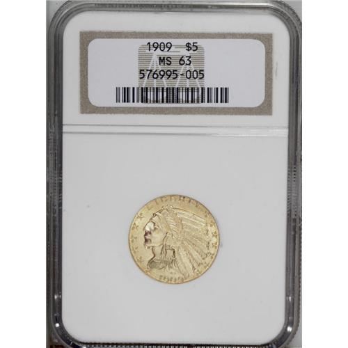 <B>1909 $5 MS63 NGC.</B></I> A brassy yellow-gold piece with hints of green on the reverse. Well struck with scattered marks and unusually strong luster for this series.<BR><BR><b>Shipping:</b> Coin/Currency (<a target="_blank" href="http://www.heritageauctions.com/common/shipping.php">view shipping information</a>)