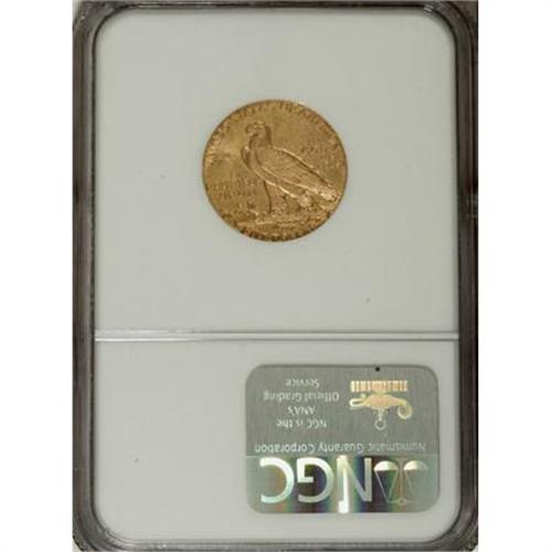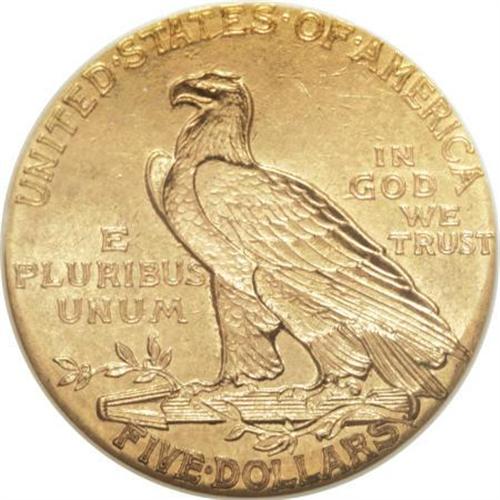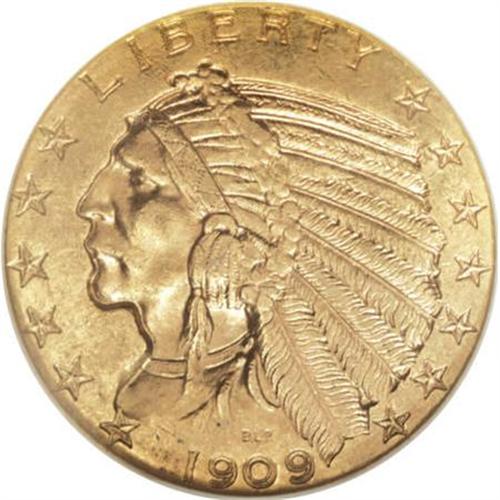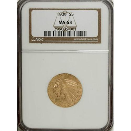 <B>1909 $5 MS63 NGC.</B></I> Boldly defined and highly lustrous, this Select example's lightly marked surfaces are seemingly close to a higher grade designation. Reddish-gold color shines from the devices, while the fields are imbued with an attractive greenish-khaki tint. A favorite issue of type collectors. <BR><BR><B>Coin Engraver:</B> Bela Lyon Pratt<BR><BR><b>Shipping:</b> Coins & Currency (<a target="_blank" href="http://www.heritageauctions.com/common/shipping.php">view shipping information</a>)