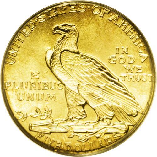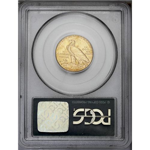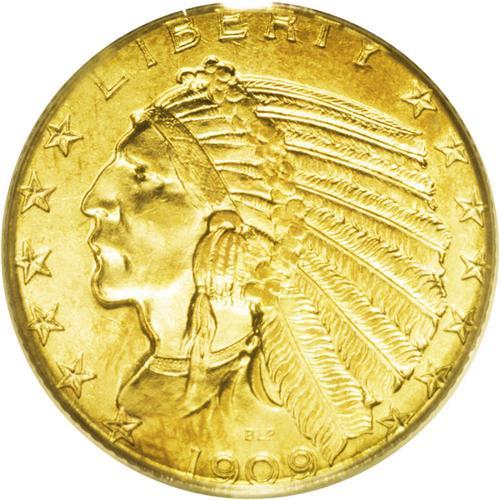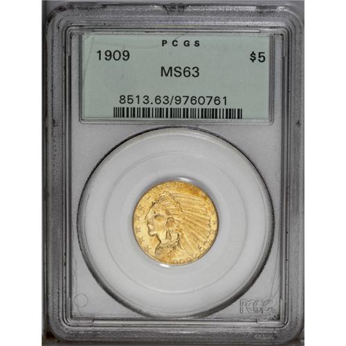 <B>1909<$5> MS63 PCGS.</B></I> Golden-orange toning drapes the obverse, while the reverse is lighter yellow-gold. A gently shimmering representative with a meticulous strike and pleasing preservation. Much less available than its Denver Mint counterpart from 1909. Encapsulated in a green label holder.