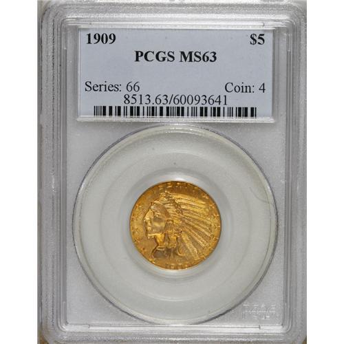 <B>1909 $5 MS63 PCGS.</B></I> Rich apricot-gold color bathes both sides of this lustrous Select five dollar. Sharp definition occurs on the design features, except for softness on the eagle's shoulder. Light contact marks on the raised, exposed fields, especially on the reverse, define the grade.<BR><BR><b>Shipping:</b> Coins & Currency (<a target="_blank" href="http://www.heritageauctions.com/common/shipping.php">view shipping information</a>)