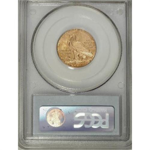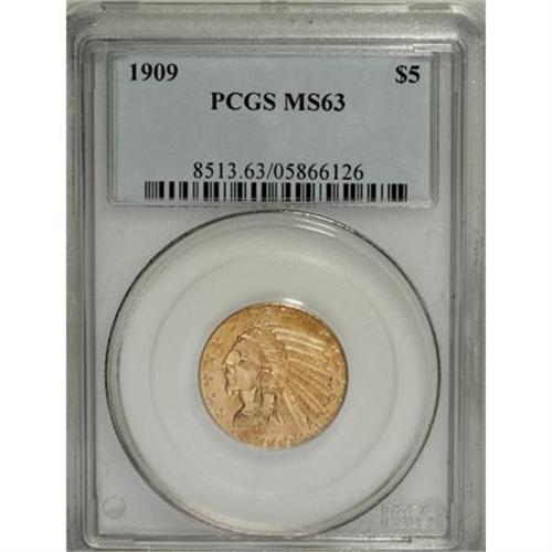 <B>1909 $5 MS63 PCGS.</B></I> A couple of tiny ticks on the Indian's cheek and a couple of scrapes above the eagle's wing account for the grade, but the deep orange-gold surfaces are nonetheless choice for the grade, with much appeal.<BR><BR><B>Coin Engraver:</B> Bela Lyon Pratt<BR><BR><b>Shipping:</b> Coins & Currency (<a target="_blank" href="http://www.heritageauctions.com/common/shipping.php">view shipping information</a>)