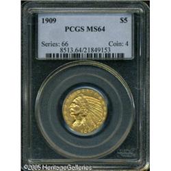 <B>1909 $5 MS64 PCGS.</B></I> This Choice Mint State Indian Half Eagle has satiny yellow-gold luster with sharp design features. It is an excellent candidate for either the date or the type collector. The Philadelphia Mint half eagle of 1909 is not considered to be rare, but examples in MS64 or finer grade are quite elusive. Lot:8677